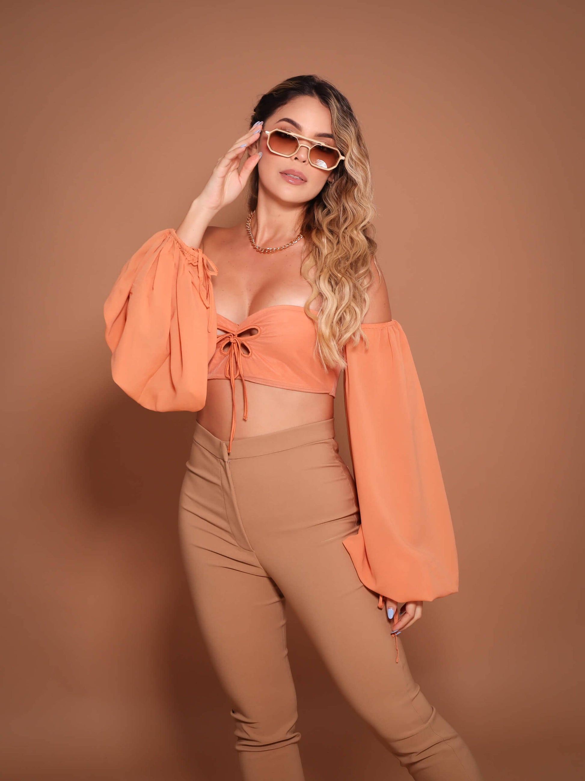 Today we want to introduce our star product: the crop top with puffy sleeves, made of mesh fabric and with the name of Jazmin.