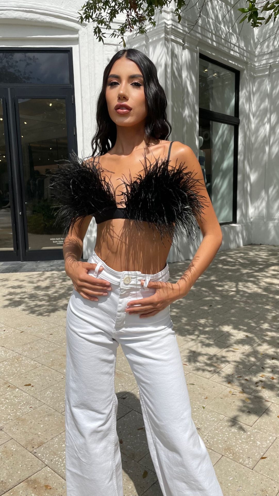 This elegant crop top is made from luxurious silk and further adorned with feathers for a unique and eye-catching look. Perfect for any special occasion, it'll give you a timeless and luxurious style.