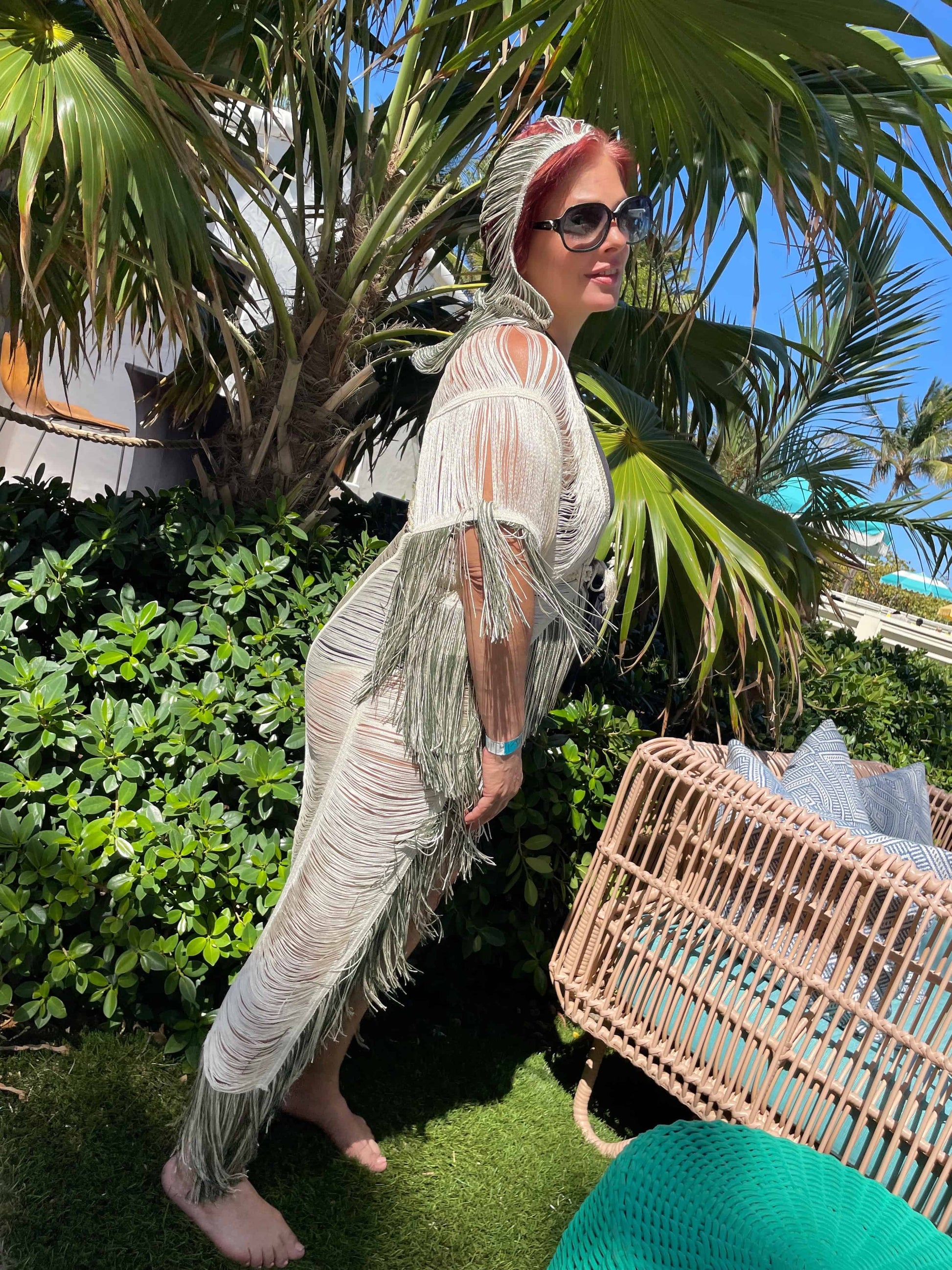 If little red riding hood had a summer look, this would be her favorite piece of clothing! This maxi kimono in threads with a hood is one of those beautiful garments that you will want to wear every day. It is a long maxi dress-style kimono, with fringes on the sides and on the sleeves, in addition to the semi-transparent detail produced by fine threads. The hood is flexible and falls fluidly. Made with fine threads that give it a sexy transparency with a small gold detail on the back.