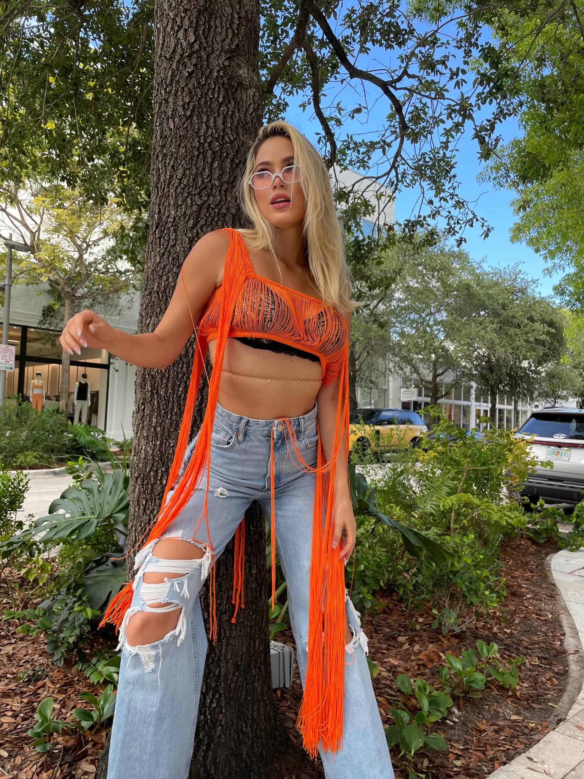 ¿Te encanta toda la estética de Coachella? ¡Este crop top con flecos largos es ideal para ti! Una increíble prenda al mejor estilo boho chic que será tu favorita en el verano. Este crop top está confeccionado con finos hilos que crean una semitransparencia súper sexy e interesante. El top tiene escote cuadrado y cubre tu pecho con finos hilos. Los flecos largos salen de los hombros y caen en mangas largas. Es la prenda ideal para moverte de un lugar a otro ya que los flecos fluyen contigo y crean un bonito efecto visual.