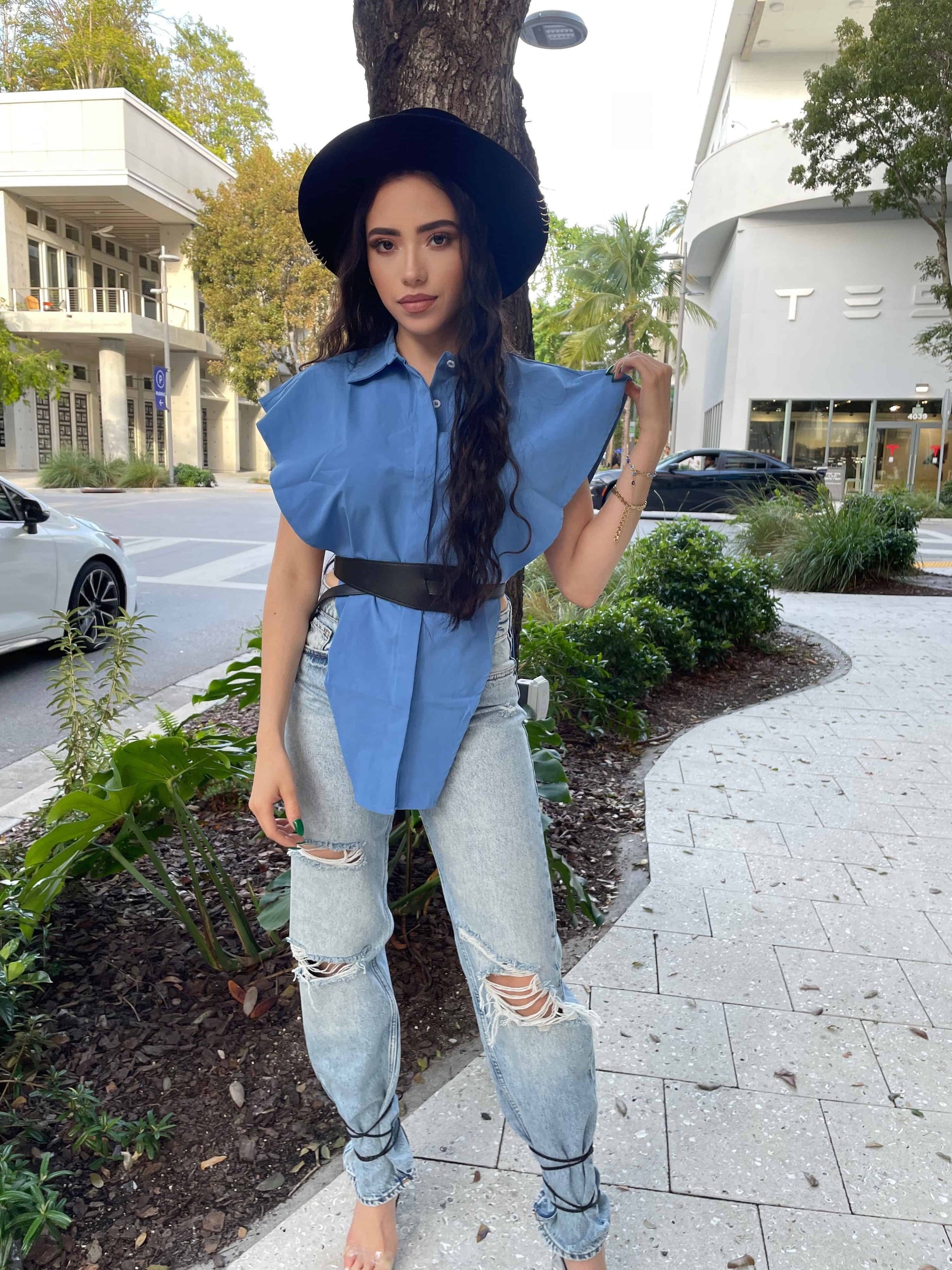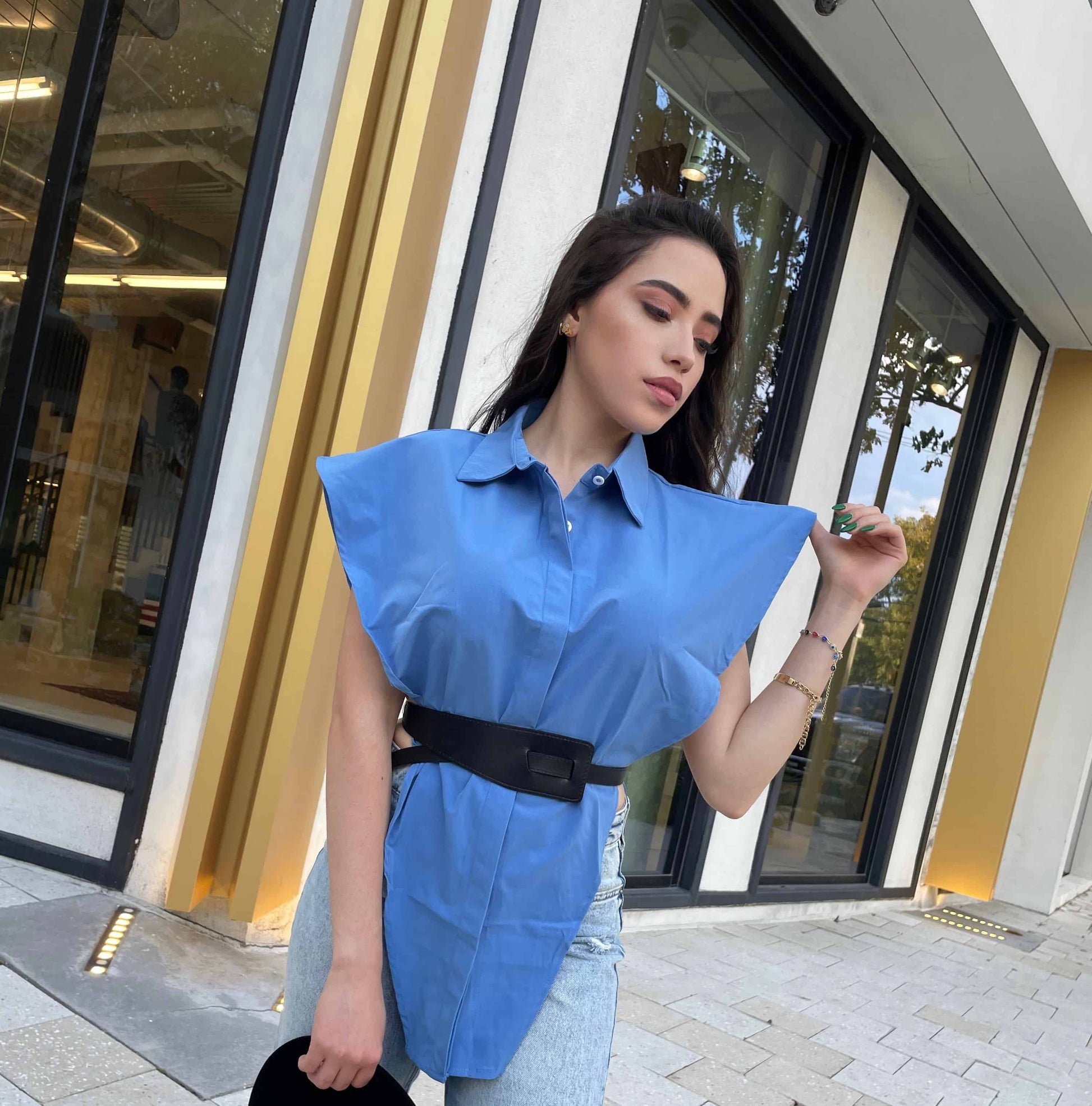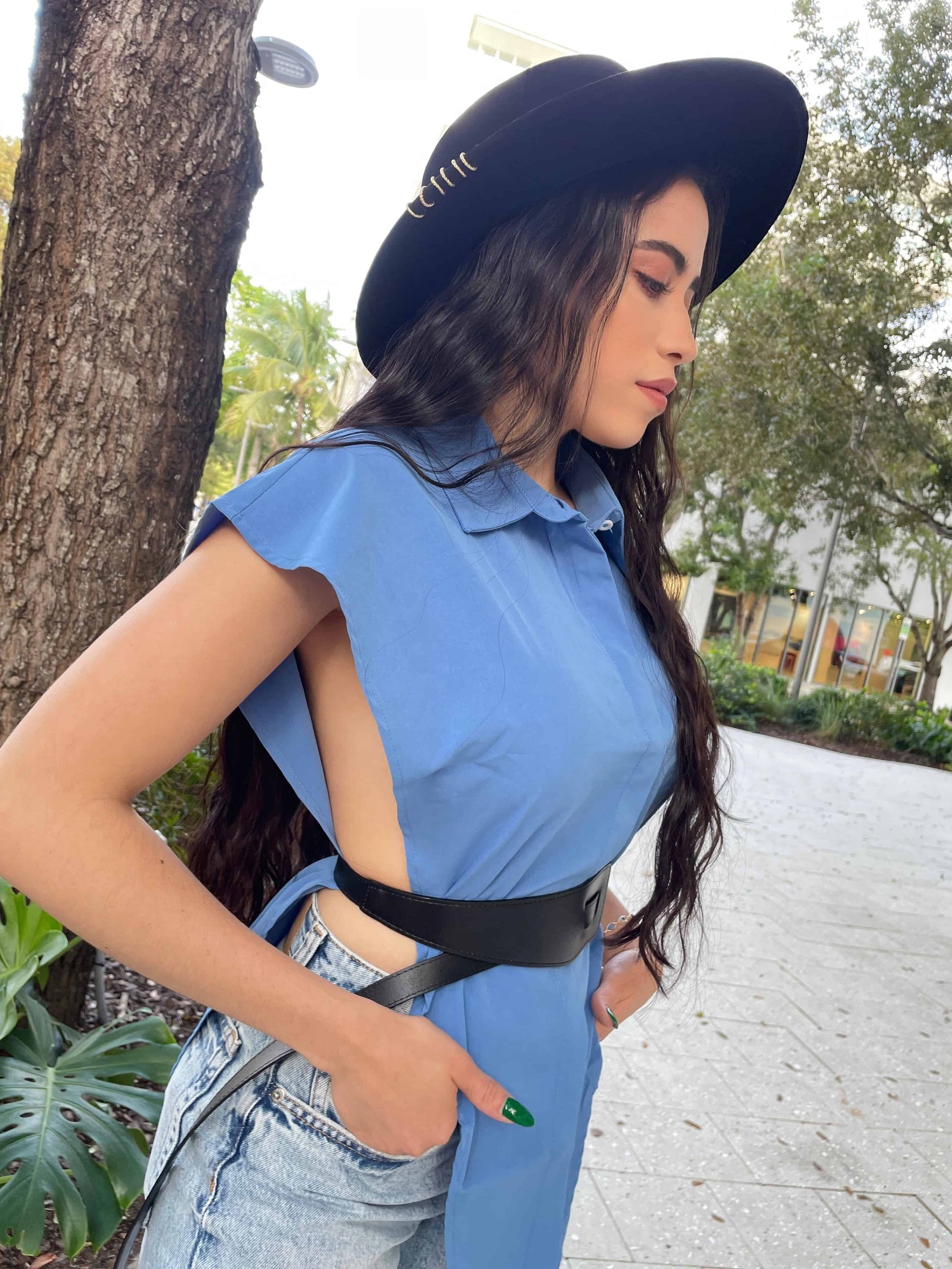 - The button down shirt style and inverted triangle with side slits make this garment a classic with an elevated touch and full of sensuality.
