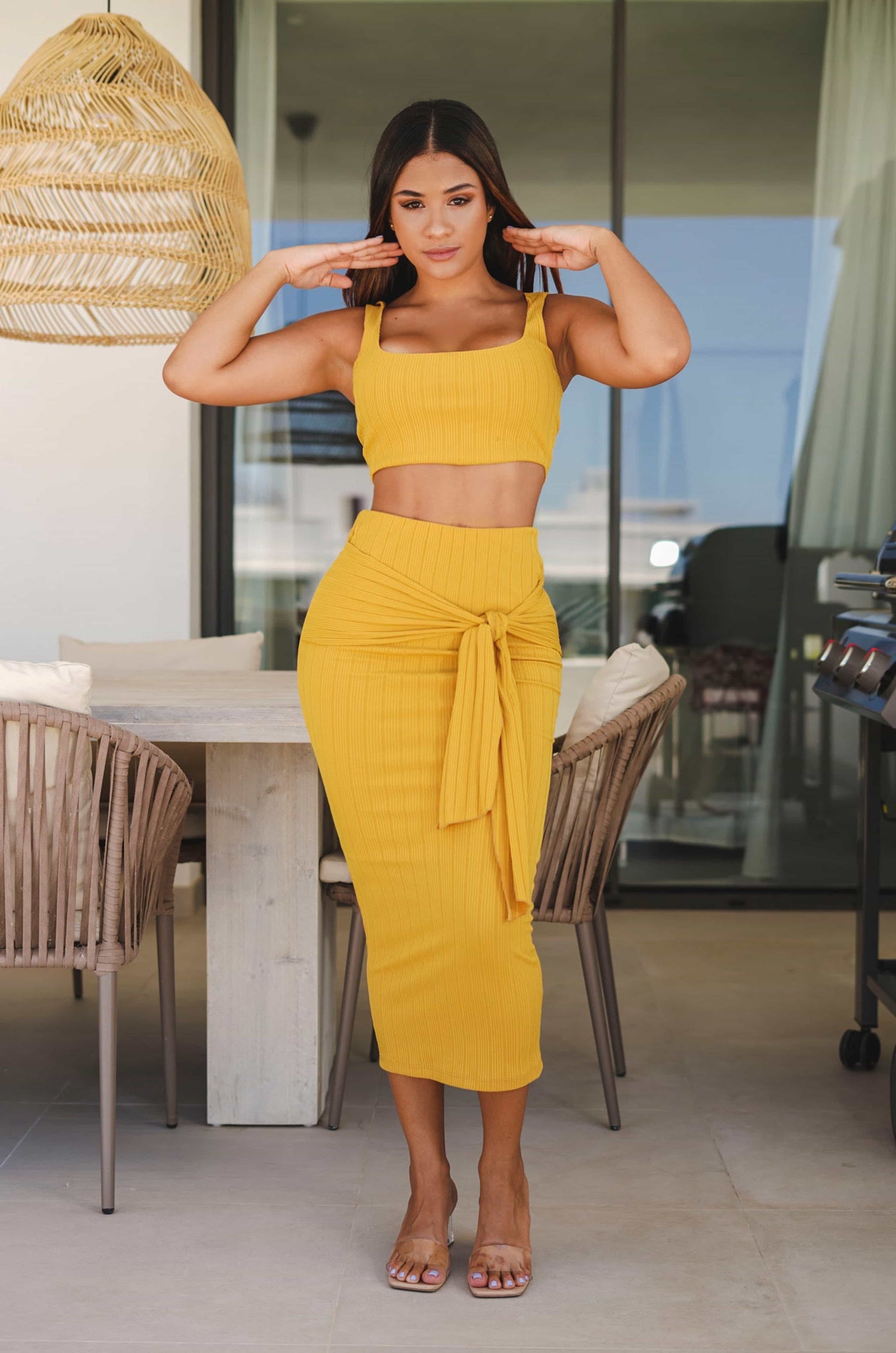 Do you want to show off with a monochrome outfit? We got you girl! This monochromatic cop top and skirt set is the perfect set for you. Made with spandex which ensures that the two garments will fully embrace your body so that your figure looks spectacular. The top is a rib-knit cropped top with a square neckline and thick straps with as few seams as possible to keep it soft against your skin. The skirt is a mid-calf length pencil style with a knot in the front to accentuate your hips. Also made in rib knit.